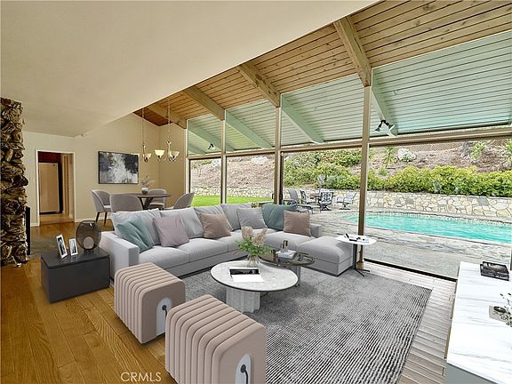 This home boasts a generous floor plan featuring three distinct living/family areas, each with soaring vaulted ceilings. The foremost living space merges a dining zone with a streamlined galley kitchen, presenting peaceful vistas of the canyon, city, and sea. The central living area welcomes you upon entry with its cozy fireplace and overhead skylight. The rear living/dining area is a haven of relaxation, with its fireplace and ceiling-to-floor windows and doors that blur the lines between the indoors and the lush outdoors. Gaze upon the serene pool and manicured gardens to unwind from daily life.