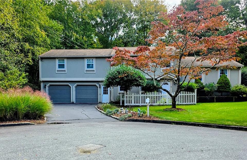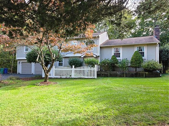 Custom Split level set at the end of a cul-de-sac on over 30,000 square feet with scattered gardens and plantings on a beautiful tree lined, private wooded lot. The huge 24X26 square foot primary suite offers sky-lit cathedral ceilings, hardwood floors and closets galore with access to the jacuzzi tub and separate shower area. Sliders open to balcony overlooking the private yard. A secondary stairwell can also access the primary bedroom suite for additional privacy. The sky-lit eat in kitchen offers granite counters, center island and top end stainless appliances. The 12X16 square feet living room offers a wood burning fireplace and gleaming hardwood floors. All newer up to date systems including the roof with paid for solar panels, new windows, on-demand Navien hot water, french drains, generator and sprinkler system. The family room offers a pellet stove and french doors lead to deck and yard. The new bulkhead makes it easy to bring in exterior lawn furniture for the winter. Lots of new shelving added in the basement for storage and organizing. The Dryvit exterior and solar panel system offers energy efficiency. This amazing home offers many extras.