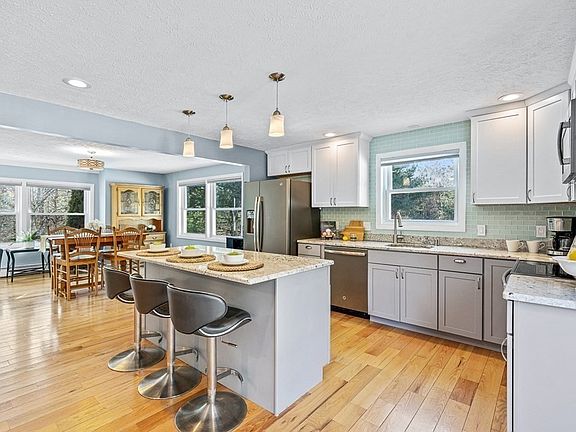 This house truly has it all! Completely turnkey, open concept, remodeled kitchen, master suite, large fenced-in yard, and private setting on cul de sac! Enter through the living rm w electric fireplace, lrg picture windows, and hardwood throughout. Next is the remodeled kitchen with all modern finishes- white/gray cabinets, granite counters, tile backsplash, ss appliances, recessed lights, and lrg kitchen island w pendant lights! Also new slider to access back deck. Kitchen is open to the dining area w built-ins and wood stove. You will also find a bonus room for office, playroom, etc with a new remodeled half bath w laundry to finish out the 1st level. 2nd level offers lrg master suite with new 3/4 bath, skylights & lrg walk-in closet w built-ins. 2 additional bedrooms with large closet space & full bathroom complete this level. Hrdwood throughout, custom blinds, lrg basement w high ceilings plus workbench. Enjoy the view of the scenic expansive yard all year long!