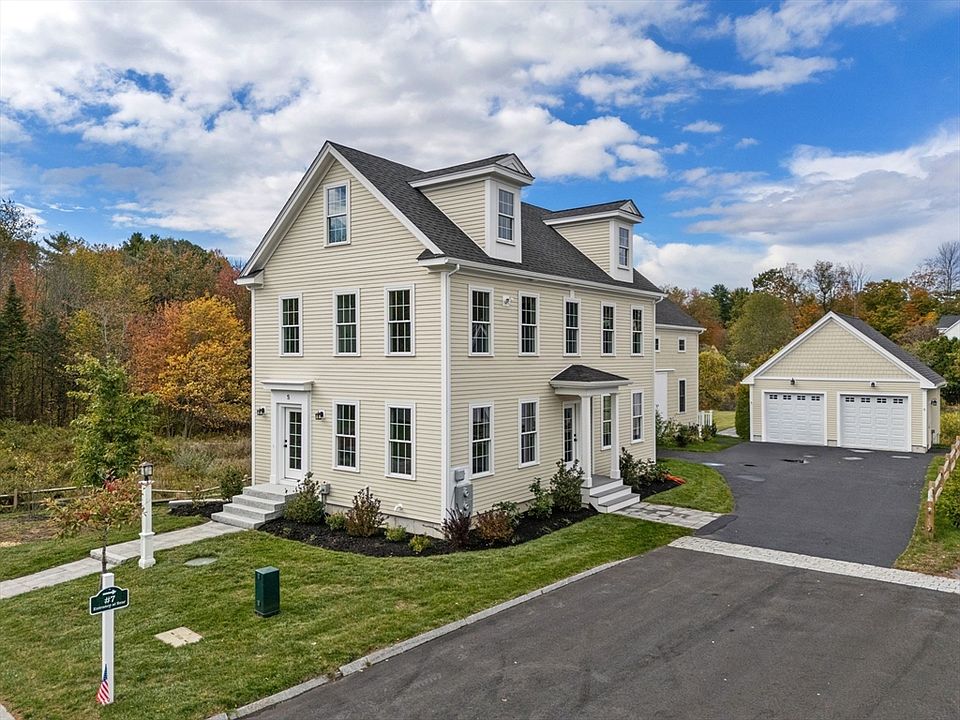 Brand-new 2,274 sqft single-family condex nestled at the end of a quiet street. This 4-bed, 3.5-bath home offers luxury selections combined with flexible living spaces. Enter through the mudroom with custom built-ins into the living room with great natural light and cozy fireplace. The modern kitchen & dining offers an oversized island, quartz countertops & tile backsplash w/ access to the oversized deck. Up the hardwood stairs the primary suite features a spa-like bath with soaking tub, tile shower & double vanity. The 2nd floor also features another bedroom with en-suite bath & tile shower and a separate laundry room. The 3rd floor has two bedrooms and a full bath. The walkout lower level provides expansion potential with walkout slider access to the patio and yard. 1 car detached garage. This home blends timeless style with modern comfort. Enjoy peaceful surroundings while less than 0.5 miles to Amesbury Town Park and schools & 1 mile to vibrant downtown restaurants and shops.