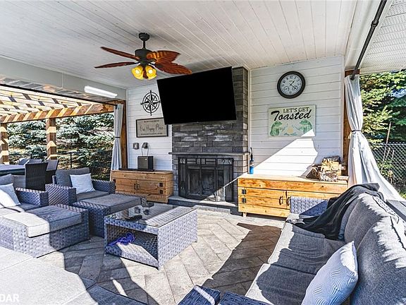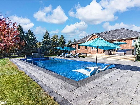 OVER 4,000 SQ FT OF LUXURY, PREMIUM UPGRADES, & RESORT-STYLE OUTDOOR LIVING WITH AN INGROUND POOL & COVERED LOUNGE - ALL IN THE HEART OF SNOW VALLEY! Located on a quiet cul-de-sac surrounded by mature trees and rolling greenspace, this showstopping bungaloft offers a rare blend of privacy and outdoor luxury in a coveted neighbourhood. Enjoy a tranquil lifestyle in a safe and established community just minutes from hiking, golf, and conservation areas, with Snow Valley Ski Resort, downtown Barrie, and Hwy 400 all close by. Set on an expansive lot, this home delivers a backyard that rivals a resort, complete with an 18x44 ft inground pool with 3 waterfall features and full sun exposure, plus a relaxing hot tub on the spacious deck. The outdoor pergola-covered kitchen and dining area delights with a built-in BBQ, granite counters, and an adjacent lounge with a wood fireplace, ceiling fan, and TV mount - perfect for evenings under the stars. Professionally upgraded with built-in irrigation, outdoor speakers, automatic lighting, and full fencing, every inch of the exterior has been designed for comfort and indulgence. Inside, the open layout flows through the eat-in kitchen and living room, anchored by a gas fireplace and a walkout to the deck for seamless indoor-outdoor connection. A formal dining room adds refinement, while three main bedrooms include a primary retreat with a walk-in closet, a deck walkout, and an ensuite with a soaker tub and glass shower. The loft offers flexible extra living space, while the Dricore protected basement provides even more possibilities with a bedroom, a full bath, a rec room, kitchenette and in-law suite potential. Additional highlights include crown moulding, pot lights, fresh paint, built-in surround sound and security, a 3-car garage with an oversized driveway, and a custom storage shed. A true statement in style, quality, and elegance, this #HomeToStay offers an unparalleled living experience inside and out!