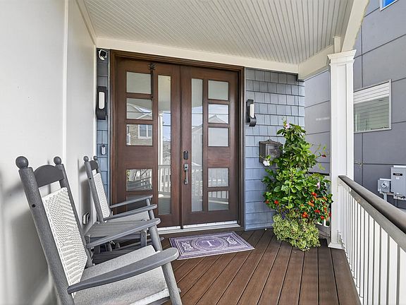 A truly enchanting home inside and out—this one is not to be missed. Built in 2014 with timeless design and thoughtful craftsmanship, this beautifully appointed 4-bedroom, 5-bath residence exudes warmth and sophistication. From the moment you arrive, you’ll be captivated by the charming front patio surrounded by lush landscaping. Step onto the inviting front porch, where rich wood craftsman-style double doors open to a lovely foyer and a bright, open-concept living and dining area. Richly finished hardwood floors, abundant natural light, and a gas fireplace with a custom mantel create a welcoming and elegant atmosphere. The chef’s kitchen is a showstopper, featuring a stunning waterfall island, high-end appliances, custom cabinetry, a pantry, and a stylish wet bar with ice maker—perfect for entertaining. A full bath and convenient laundry area complete the first floor. As you explore the home, you’ll discover thoughtful touches throughout, from the convenience of a four-stop elevator to the sleek five-panel glass doors that infuse the space with modern style and natural light. Upstairs, the primary suite impresses with a dramatic bay window and vaulted ceiling that enhance the open, airy feel of the space. The luxurious ensuite bath and private deck make it a true retreat. Two additional junior suites, each beautifully designed, complete the second floor. The third floor offers even more versatility with a spacious bedroom, built-in desk and office area, and a strikingly designed wet room—ideal for guests offering a private getaway. Outdoor living is equally impressive with a private entertaining patio featuring a custom built-in hot tub, outdoor TV, bar area, and plenty of space for dining al fresco. The enclosed outdoor shower offers convenient pass-through access for added privacy and ease after a day on the beach. Perfectly situated in a charming Margate neighborhood just two blocks from the beach and within walking distance to local shops and eateries, this home truly checks all the boxes for shore living in comfort, style and convenience.