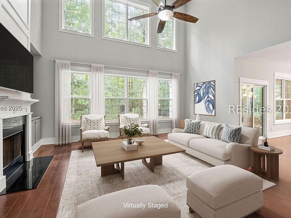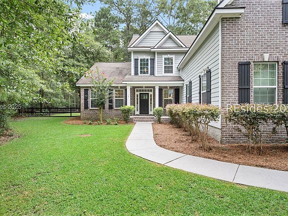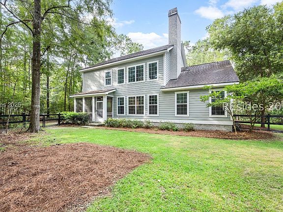 An UNBEATABLE price for size & location! - Tucked within a secluded cul-de-sac, offering .77 acres of privacy, this charming 5-bedroom home supplies every convenience. From soaring ceilings to rich wood floors, enjoy a freshly painted interior, craftsman trim, handsome fireplace w/built-ins, wall-to-wall windows & desirable open floorplan. Eat-in kitchen offering crisp white cabinets, double ovens, tile backsplash & pendant lighting. Large first floor owner's suite w/tray ceiling & generous bath, features 2 sink vanity, tiled shower and separate tub. Four guest bedrooms upstairs, (including an oversized bonus with dedicated bath), each with LVP flooring and ample storage. Outdoor living is a breeze with your screened patio, fenced yard & calming wooded views. Rose Dhu Creek Plantation is a Bluffton favorite, providing gated security, community pool, gathering place, ~6 miles of trails, & fun social events throughout the year. Take advantage of this tremendous value and discover why Rose Dhu is the place to be!