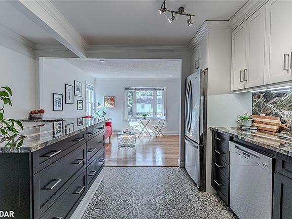 CHARACTER-FILLED EAST END BUNGALOW WITH MODERN UPDATES, A DETACHED GARAGE & BACKING ONTO A SCHOOL! This charming East End bungalow is perfectly situated less than five minutes from downtown shops, dining, Johnson's Beach, the MacLaren Art Centre, and the Barrie Public Library, with parks and recreation close by. Families will love being able to walk to both Oakley Park Public School and Barrie North Collegiate, creating an easy daily routine. The exterior offers curb appeal with vinyl siding in a board and batten style, a welcoming porch, and a tidy lawn, while the fully fenced backyard extends your living space with a large deck, soffit lighting, gas BBQ hookup, and peaceful views backing onto Oakley Park P.S. Natural light fills the living room, complemented by pot lights, crown moulding, and a bay window that adds warmth and charm. The updated kitchen features two-tone cabinetry with plenty of storage, granite counters that carry through to the backsplash, stainless steel appliances, undermount lighting, and patterned flooring. Two comfortable bedrooms are located on the main level, served by an updated bathroom with a modern tile surround, a built-in shower niche, and heated floors. The rear door provides easy access to the basement area, which offers future potential for an in-law suite and currently hosts a third bedroom, a spacious rec room, a full bathroom, and generous storage. A detached 24' x 12' garage is ideal for parking, hobbies, or extra storage, and the driveway fits four vehicles with ease. Move-in ready and full of character, this East End gem is a wonderful place to call home!