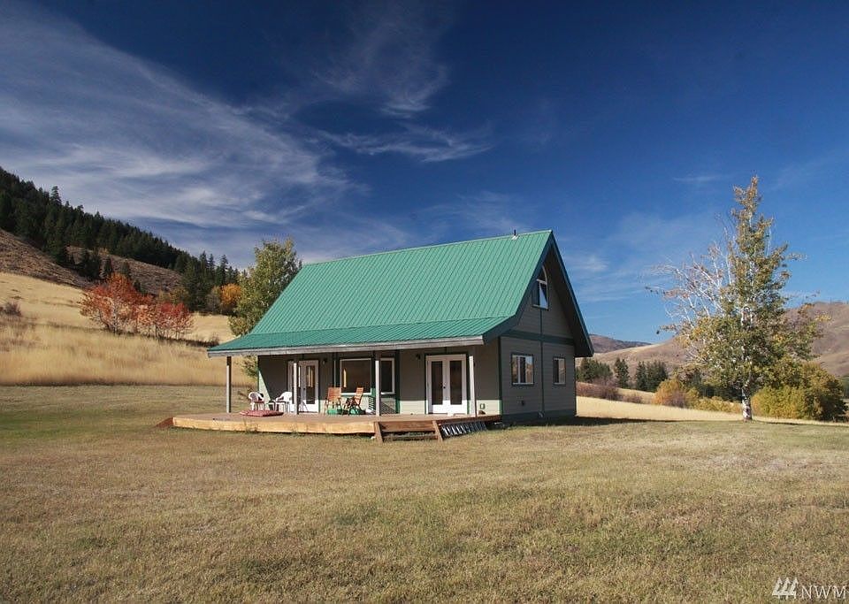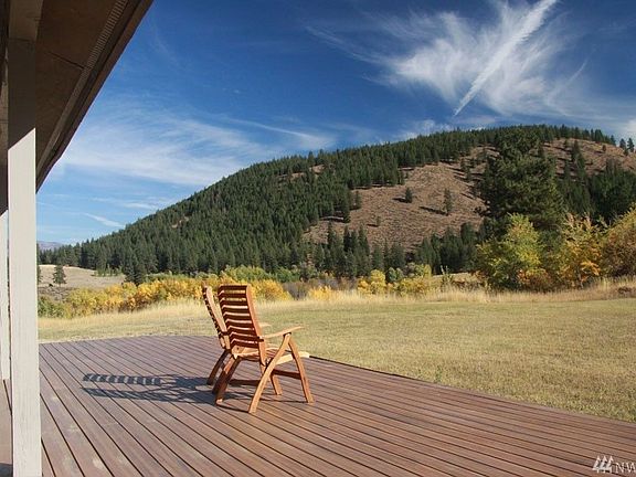 TWISP RIVER: Custom home on 20 acres, with beautiful meadow and mountain views. Features 3 BDRM, 2 BA, large windows with expansive views of the meadow, aspen grove and surrounding mountains. Many nice touches, large open upstairs with bathroom, pellet stove, full bath downstairs, open kitchen, French doors leading to the deck. Secluded and convenient location, truly a secret little place not far from Twisp.