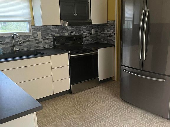 Automatic under-sink drawerNewly remodeled kitchenPush-opening cabinetsCovered front porchOverlooking the pond