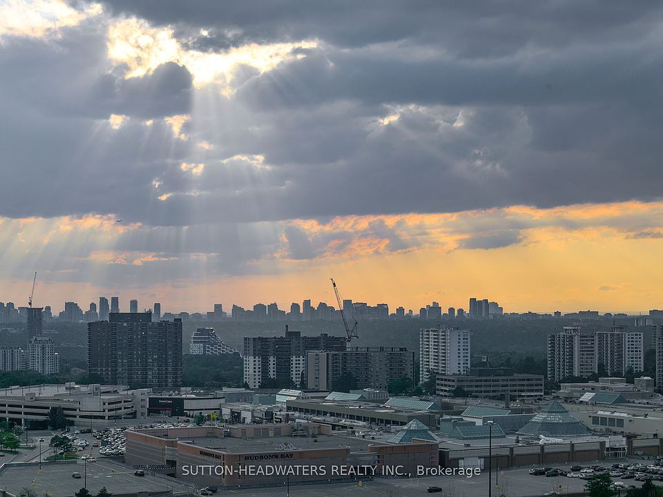 Penthouse Living with Unparalleled Views. Soar above the city in this 23rd-floor penthouse, where sweeping skyline views meet a warm sense of community. This 2-bedroom, 2-bath condo is more than a home, its a lifestyle. The enclosed, permitted balcony extends your living space and serves beautifully as a dining room with long, uninterrupted city views.The bright and spacious living room flows seamlessly from the functional galley kitchen, creating a central gathering space for family and friends. The second bedroom, with its two large closets, is ideal as a guest room or home office. The primary suite offers west-facing skyline views and a private ensuite. Set within acres of landscaped grounds filled with mature trees and gardens, this gated community offers resort-style amenities: an indoor pool, basketball and squash courts, gym, ping pong, tennis courts, convenience store, party room, outdoor BBQs, and even a community garden. Stroll shaded walkways or relax in peaceful sitting areas all just steps from TTC, Hwy 404, Fairview Mall, and every convenience. As one resident said, "It is a gift to live here". Experience safety, privacy, and peace of mind in this truly special residence.