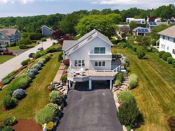 Waterview Contemporary located on one of the highest points on Overlook Drive this home offers gorgeous water views of Bristol Harbor and spectacular sunsets. The recently redesigned kitchen offers all top of line appliances such as Thermador, Subzero and Electrolux and custom cabinets. The open floor plan enjoys an abundance of natural light along with soaring vaulted ceilings, gleaming hardwood flooring, a spacious dining area and living room with gas fireplace. A first floor bedroom could provide a home office area or guest bedroom which is adjacent to the laundry room and full bathroom. On the second floor there is wonderful master suite, with private balcony, and second guest bedroom. The finished lower level is finished with accented walls with bead board, recently installed carpeting, a half bath, utility room and plenty of room for storage. The whole house generator is in place, providing emergency back-up power. The professionally maintained landscaping with a lawn sprinkler system served by a well, provides for lush plantings. Enjoy watching the sailing activity in the harbor, as well as the July 4th fireworks while sitting one the oversized mahogany decks aluminum rail system. This location is a very easy stroll to all the shops and restaurants in town, as well as Colt State Park, Bristol Harbor and the nearby bike path.
