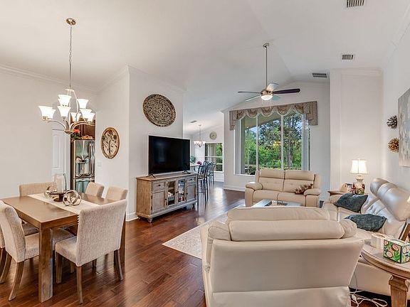 This recently remodeled home offers a clean, open floor plan with plenty of natural light and thoughtful upgrades throughout. The kitchen features stainless steel appliances, granite countertops, a tile backsplash, and all-wood cabinets, along with a cozy breakfast nook that opens out to a screened lanai. The main living and dining areas have wood flooring, high ceilings, and updated lighting, making the space feel warm and welcoming. The primary bedroom includes upgraded carpet, plantation shutters, a walk-in closet, and a private bathroom with quartz countertops, double sinks, and a walk-in tiled shower. Two additional bedrooms also have upgraded carpet and shutters, and there's a second full bathroom with a tile tub/shower combo. Small dogs with approval.