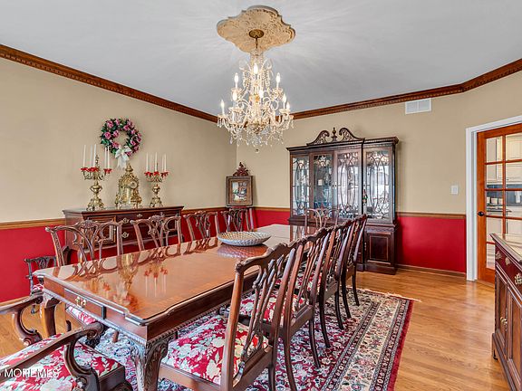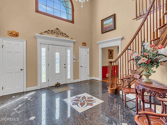 This stunning 5 bed, 3.5 bath Tudor-style home sits on over 2 acres of beautifully landscaped, flat grounds with easy county road access. The home features a 6ft chandelier foyer with circular staircase, formal living and dining rooms with chandeliers, crown molding throughout, and an entertainer's dream 21x21 family room plus 33x18 eat in custom kitchen opening to a lifetime nail free AZEK deck. A first-floor guest suite and large laundry room with cabinets and sink, leading to a 3-car garage, add convenience and functionality. The master suite offers a sitting room, walk-in closet, and spa bath with Jacuzzi and skylight. Back stairs lead to the other bedrooms, each with walk-in closets, complemented by a 30x11 bonus room with seven closets. Colts Neck residents enjoy access to two of New Jersey's top 10 magnet high schools and premier private school options, making this home ideal for both lifestyle and education. Additional highlights include a lifetime Timberline HD Slate roof and maintenance-free façade, hardwood floors, indoor/outdoor security, full-house generator, walkout basement with home offices and billiard room, gazebo, pagoda, and 11 zone lawn sprinkler system.