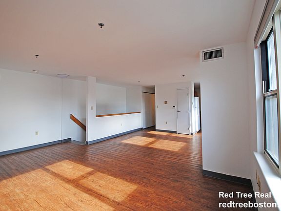 Three bedrooms and one bath comprise the lower floor. Deep closets. Upstairs is the oversized living room and dining area. Galley kitchen, half bath, and laundry hookups. Incredible views of Boston.