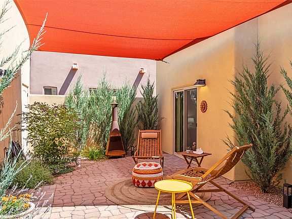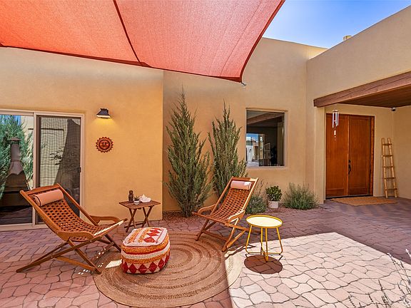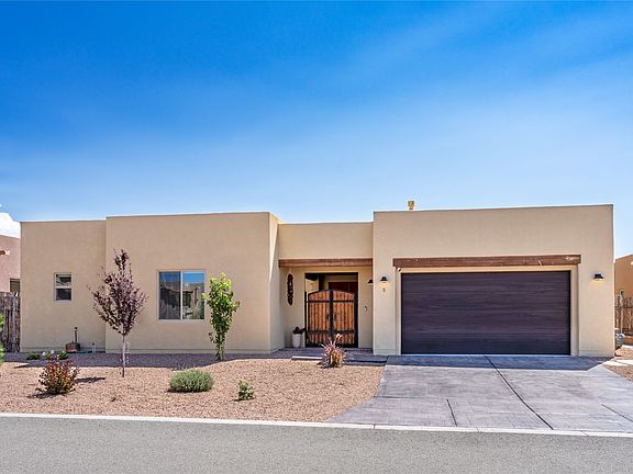 Discover the charm of the Zaguanita plan in La Pradera, a true gem built in 2022 that blends modern comfort with classic Santa Fe style. This beautifully designed home features a two-bedroom, two-bath main house, complemented by an attached one-bedroom casita and a spacious two-car garage. The open-concept living area includes a gourmet kitchen with a cozy dining nook, seamlessly flowing into a great room adorned with high ceilings, custom beams, and a gas kiva fireplace, perfect for gatherings. As you enter through the main gate, you're welcomed by a covered entry that leads to an intimate interior courtyard. This space is thoughtfully landscaped and enhanced with a stylish, detachable sunshade, creating an inviting outdoor living area. The meticulously maintained grounds include flagstone walkways, raised garden beds, and a spa adjacent to a generous covered portal with its own fireplace, ideal for year-round entertaining. Backing onto an arroyo and open space, this property offers a unique sense of privacy, making it a serene retreat that feels worlds away, yet is close to all the amenities Santa Fe has to offer. Schedule your showing today.