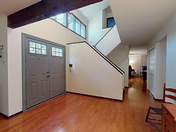 Stunning Contemporary Retreat on Private Wooded Acre. This 2,851 square foot residence, situated on a private one-acre wooded lot, offers an unparalleled living experience surrounded by nature's beauty. Discover the perfect blend of modern comfort and natural serenity in this exceptional 4-bedroom, 3.5-bathroom contemporary home. Step inside to gorgeous hardwood floors that flow seamlessly throughout the main living areas, creating warmth and elegance in every room. The open floor plan creates a wonderful sense of space and connection, with the living room flowing beautifully into the dining room, and the family room opening to the kitchen - perfect for both daily living and entertaining. The cozy family room features a wood-burning fireplace, creating the perfect gathering spot for relaxation and ambiance and also directly accesses the crown jewel of this home, the spectacular sunroom with heat and tile flooring, featuring a sunken hot tub, six skylights and floor-to-ceiling windows that provide breathtaking views of the surrounding woods. This space offers the ultimate in relaxation and entertainment, bringing the outdoors in while maintaining comfort in every season. The first floor also offers excellent potential for an in-law suite conversion, providing flexibility for multi-generational living or guest accommodations. Retreat to the luxurious master suite featuring soaring vaulted ceilings, a skylight that bathes the room in natural light, and a ceiling fan for year-round comfort. This private haven offers the perfect escape at the end of each day. The full basement is half-finished, with a pergo floating floor, offering immediate additional living space with potential for further expansion. Kitchen & Practical Features: The eat-in kitchen boasts newer stainless steel appliances and a ceiling fan, combining functionality with flow. The thoughtful design ensures both cooking and entertaining are a pleasure, with convenient dining space right in the heart of the home. The spacious layout is enhanced by the exterior features, fresh beautiful vinyl siding (replacing T1-11) and stucco exterior details that complement the contemporary design, new concrete sidewalk and stoop, and stylish Anderson front doors. The home comes complete with stainless steel appliances, washer and dryer, and a garage with newer doors and openers. Extensively updated over the past few years with major improvements throughout, recent upgrades include a new furnace and AC system and a newer hot water heater and roof for reliable comfort and efficiency. Set on a full acre of wooded property, this exceptional home provides the rare combination of privacy, tranquility, and endless opportunities to enjoy nature right outside your door combined with contemporary living and flexible spaces that can adapt to your lifestyle needs. Don't miss this opportunity to own your own private retreat. List of all updates is in the documents. With the price reduced $35,000, this home offers tremendous potential for the right buyers to have the home just the way they choose.