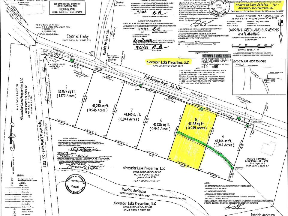 LOT #5 of "Anderson Lake Estates"/NC PIN#: 3746114387--newly developed lots. Enjoy a nice spacious lot offering 0.945 Acres. Public water available at street for buyer to tap onto, septic tank will be needed (buyer to do perc test with Alex. County Environmental Health). Restrictions (in Associated Docs) require size requirements to be 2100 sqft for a single story dwelling or no less than 2600 sqft for any 2 story dwelling--see DB: 666/PGS: 2383-2389 for all info. Drainage Easement on property, see plat 19-95. Setback requirements as per county zoning--40' front, 15' side, 40' rear - See PLAT Bk: 19/PG: 95 (in Associated Docs). Great location and close to Lake Hickory. Build your dream home here! EASE *There is a farm nearby as well as chicken houses*.