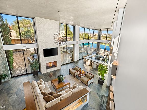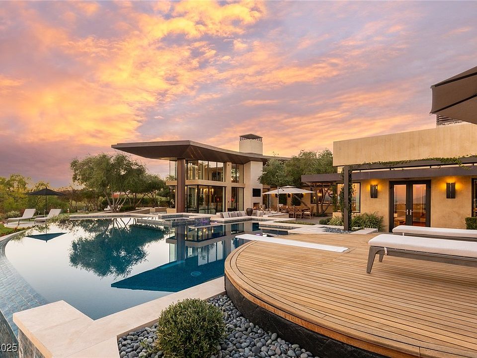 Nestled on a premier ridge lot in The Ridges, 5 Promontory Ridge Drive is a 10,621 sq. ft. desert contemporary masterpiece offering unobstructed views of the Strip, city and mountains. This custom-built estate features 6 bedrooms, 9 bathrooms, a casita, and a 6-car garage. Designed for both entertaining and relaxation, the home boasts a resort-style backyard with a pool, spa, outdoor kitchen, basketball court, putting green, and more. Inside, enjoy a private theater, sunken wet bar, game room, gym, and dual lofts. The primary suite is a retreat with a sitting area, dual-sided fireplace, custom closet, and spa-inspired bath.
