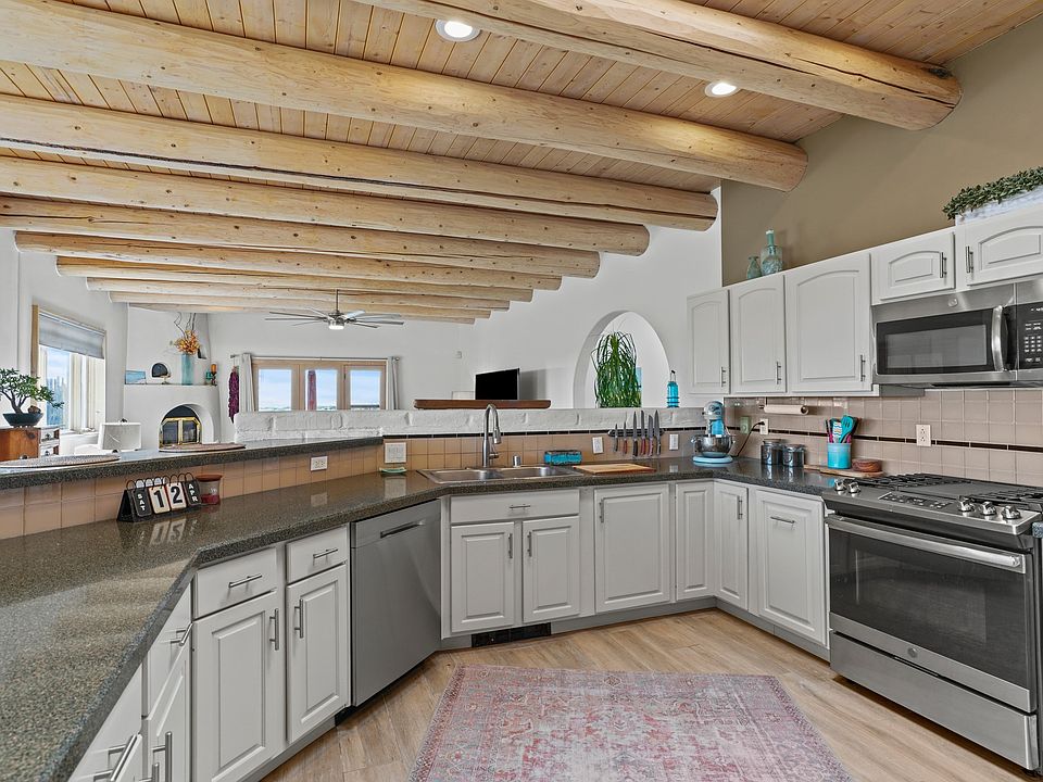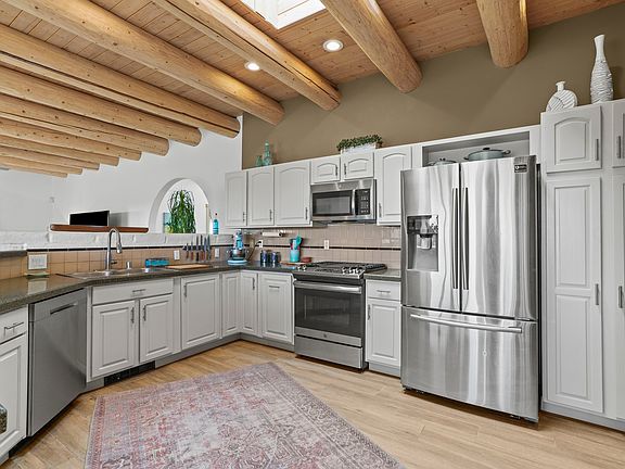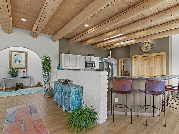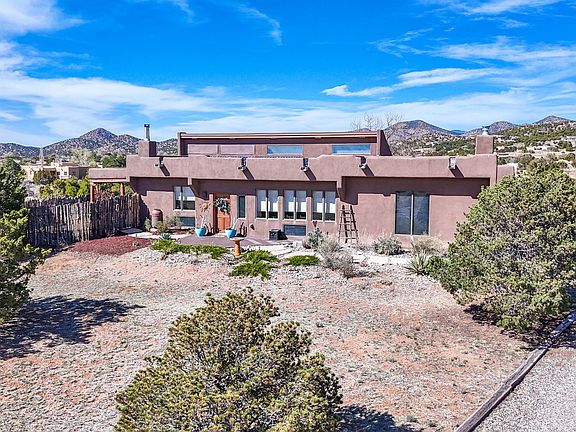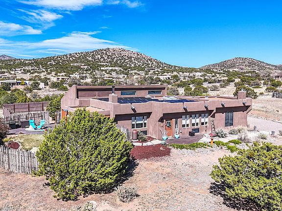 Welcome to this attractive passive solar home at 5 Puerto Road in the popular community of Eldorado, which is just a 15-minute drive south of the Santa Fe city limits. Located off of a quiet cul-de-sac and bordered by a spacious greenbelt, this gorgeous light-filled home on 2 acres is the one you’ve been waiting for. Upon entry you will notice the distinctive and appealing open floor plan design as the spacious kitchen opens to the living and dining rooms. You’ll also enjoy the high ceilings with vigas in this single level home with beautifully-tiled flooring and no interior steps. The primary suite features clerestory windows, a walk-in closet, a separate, designated work or exercise area and direct access to the private outdoor hot tub! Additional and beneficial features are the newer photovoltaic solar panel system that significantly reduces the electric bill, trombe walls, a kiva fireplace and the oversized 2-car garage. The southwestern views of the Jemez, Ortiz and Sandia Mountains are magnificent. For the outdoor enthusiasts, Eldorado contains the best walking/biking paths and boasts one of the best outdoor swimming pools in Santa Fe County.