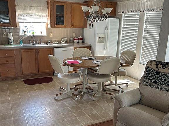 This well maintained beautifully fully furnished 3 bedroom 2 bath home is move in ready. The floor plan is one of the best in the community.. Walk up the steps and into the living room with floor to ceiling sliding glass door looking out the front. The living room furniture is well appointed.From the living room cross over to the large Kitchen with a dinning table, Dishwasher, Refrigerator, and Stove. Solid wood cabinets with lots of storage!Turn right and you can see the washer and dryer with overhead storage and an exterior door. Back in the living room walk down the hall to the first bathroom and all three bedrooms. At the end of the hall is the master bedroom with an en suite bathroom. In the morning grab your favorite coffee and walk down to the Very Large screened in porch with ceiling fan. Your privacy assured since your lot backs up to a forrest.Just below the porch is the shed. A carport was built in 2019. The screened porch was built in 2019. the HVAC was installed in 2016. And the beautiful green metal roof was put on in 2023. Now for the great part of this community. The community is full of 12 different clubs one can join like fishing club and shuffleboard club.How about a driving range, Pool hall, pool, sauna/hot tub, Tennis courts new popular sport of Pickle Ball, Social dinners and dances. When you want to entertain a large group of family or friends reserve the Lake side pavillon, You said you wanted a winter getaway with lots going on and you have found it a Saddlebag Lake community. The price is right to sell quickly so call for an appointment today!