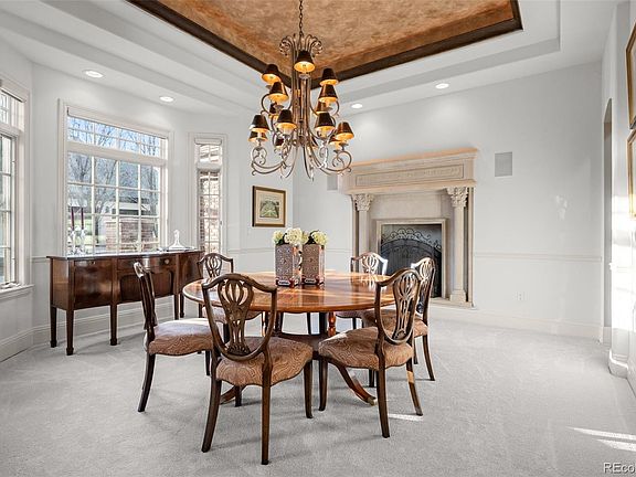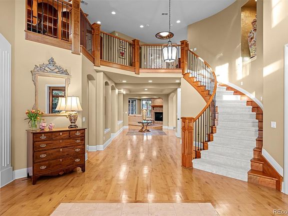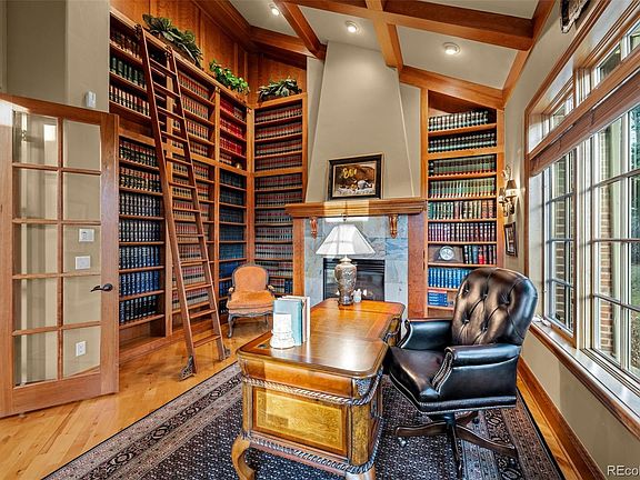 Tucked in an interior .6 acre lot in gated Buell Mansion, quality of construction permeates this home. A grand staircase complements the airy entry introducing the stately characteristics of 5 Redhawk Run. An office with soaring ceilings and bookshelves filled with meticulously color coded books creates a formal ambiance for your in-home office. To the left is a sunlit dining room large enough for gatherings. Travel further back and the formal living room boasts two stories of windows looking out into the private, fenced yard and leads to one of two covered outdoor seating areas. The kitchen features a large island, Viking stove, a cozy family room with brick fireplace and built-in bookcases and an eat-in breakfast area, all leading to the second outdoor covered living area. In your outdoor oasis find a hot tub, fire pit and built-in fireplace. A back set of stairs take you directly to the three ensuite bedrooms as the primary is a separate sanctuary at the top of the formal stairs. The large primary bedroom features high ceilings, a fireplace, a sitting room with a wet bar and allows access to a private outdoor patio. The primary bath has dual vanities, heated floors, steam shower and a large jetted tub. The huge walk-in closet has a stackable washer and dryer and plenty of space. Travel to the basement for another level of luxurious living with two bedrooms, a bathroom, a large recreation room and huge bar that includes a full refrigerator and convection microwave. There is ample storage and a staircase from the four car garage directly to the basement, perfect for a mother-in-law or or nanny as well as a dog wash for your furry friends. The lot is large enough to add your own pool if you desire, or use the five star amenities of Buell Mansion that include a tennis court, swimming pool, event space and even a stocked pond for fishing. All of this is in the Cherry Creek School District and prized CHVE as well Private school options just minutes away.