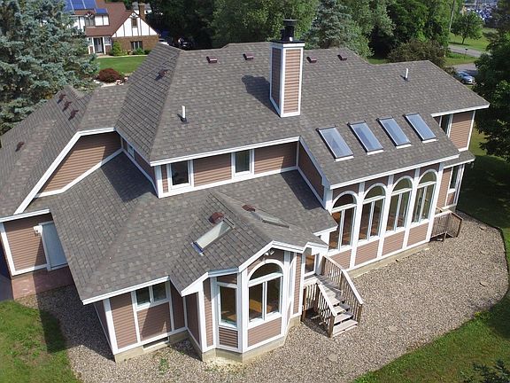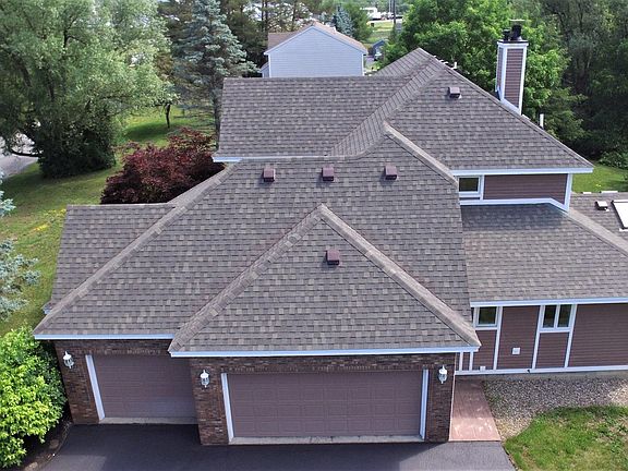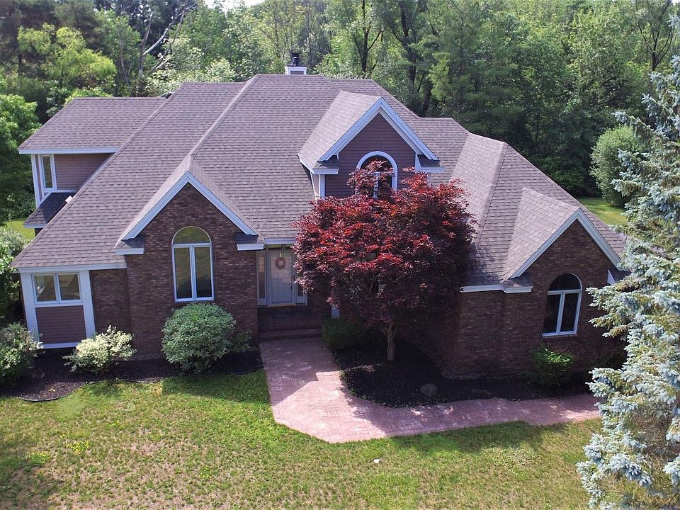 Custom home ~ classic colonial exterior with an open contemporary flair on the interior. Brand new roof, fresh neutral paint, new carpets. Sought after first floor master bedroom with spacious walk-in closet. Master bath features a door-free shower (no pesky glass to clean), jetted tub, double vanity, privacy toilet and skylights. The great room is drenched with natural light and looks out to a wooded natural area beyond the yard. Crisp, open kitche with newer Bosch dishwasher, Whirlpool double ovens and refrigerator, JennAire gas cooktop. Dining area and great room share a double sided gas fireplace ~ originally wood burning, could be converted back. Basement has finished area/rec room, high ceilings. Three car side load garage with new openers. Private cul-de-sac setting.
