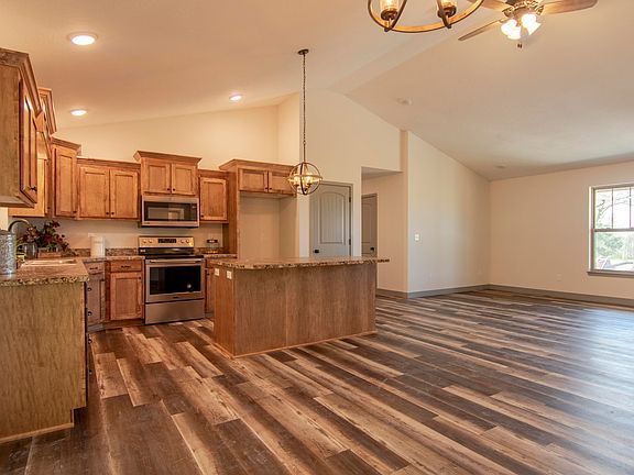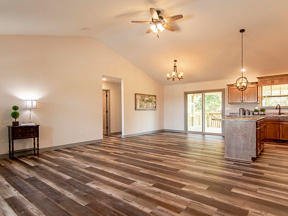 NEW BUILD, on 4+/- ACRES, is on a winding (private) ridge top road. W/3 bedrooms & 2 baths, this ranch-style home has a breathtaking backdrop of wooded trees just beyond the level, grassy yard. When entering, you will notice the durable plank flooring, from Howell's Carpet, in gray/brown-toned coloring. The interior is trimmed w/thick, gray base, accented w/matching doors throughout the main level. Medium gray walls lead you to the open kitchen w/the focal point being the 8-ft island, allowing room for extra storage. Custom cabinets from J&J Cabinetry follow 2 walls of rich, medium wood grains. An expansive covered deck will make you enjoy each & every Season. The master has a shower, large vanity w/double sinks & walk-in closet. There are 3 garages in the main and 1 down, totaling 4.