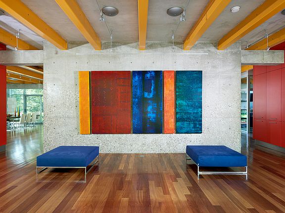 With a glass house, the line between outdoors and indoors begins to blur. This modernist glass house offers the best in design, materials and aesthetics. 5,500 square feet of dramatic, warm and inviting space, complete with five bedrooms and four and half bathrooms. The main level features a prominent living room with 20' ceilings, dining room, kitchen and den while all of the bedrooms are located on the 2nd level. The full finished lower level offers flex space for entertaining and the attached 3-car garage brings the total square footage over 8,000. While the dramatic glass walls are the most prominent feature of the home's design, what makes the house truly special is its integration into the one acre of natural surroundings. The property won a 2008 American Institute of Architects Award for interior architecture.