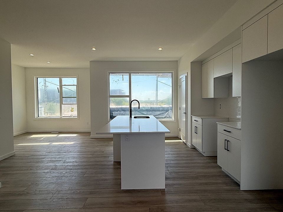 Open concept layoutModern kitchenSleek quartz countertopsStainless steel appliancesFloor-to-ceiling windowsTons of natural lightFunctional storage solutions