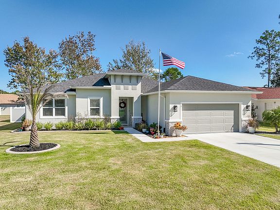 Welcome to this like new contemporary styled home in Palm Coast with concrete block construction and thoughtfully designed living spaces. From the moment you step inside, you’ll notice the bright, open layout and modern touches that make this home feel both stylish and welcoming. The kitchen is a chef’s dream with stainless steel appliances, quartz countertops, subway tile backsplash and a large island with bar seating, perfect for casual meals or gathering with friends! The home flows seamlessly with modern plank tile flooring throughout, and the flex space can easily serve as a cozy home office, creative nook or retreat. The primary bedroom is a relaxing haven, complete with a tray ceiling, walk-in closet and a spa-like bath featuring a tiled walk-in shower with glass enclosure, quartz countertops and brushed nickel fixtures. The second bath is equally inviting with a subway-tiled shower/tub combo and matching finishes. Every detail has been designed with ease in mind: a laundry room with sink, 9'4" ceilings and a two-car garage with epoxy-coated, non-slip floor. Natural light pours through the three-paneled glass front door, while LED lighting throughout keeps the home bright and energy-efficient. Step outside to enjoy a covered lanai overlooking a fully fenced backyard, perfect for family gatherings, pets or quiet evenings. There is plenty of room for a pool to make this backyard your very own oasis! With an irrigation system, full rain gutters, stone-accented stucco exterior, and high-efficiency dual-pane windows, this home blends beauty, comfort and practical living. With a 10-year structural warranty, termite bond, new roof, HVAC and water heater, Set on 0.23 acres, this home offers the perfect combination of modern style, comfort and everyday livability. Schedule your showing today!