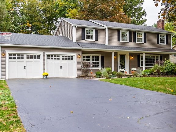 Situated in a desirable neighborhood, this 2,188 SqFt, 4 beds, 2.5 bath colonial style home is close to Bushnell's Basin, 96/490 & everything Pittsford has to offer with the privacy you are looking for. Fantastic curb appeal with new vinyl siding, gutters and garage doors 2019. Enter into the welcoming front porch and then formal living room with new hardwoods in 2019, gas fireplace & bay window offering tons of natural light. Hardwoods continue into the formal dining room and chef's dream kitchen remodeled in 2014 with custom cherry cabinets, quartz countertops, tile backsplash and stainless steel appliances. Large family room is perfect for additional living space. 4 spacious beds upstairs with hardwood floors including master with two walk in closets and ensuite! 2nd full bath remodeled in 2018 with modern vanity, fixtures & tile shower. Park like backyard boasts a patio, hot tub and firepit! Partially finished basement. Furnace 2019, Bosch Tankless Hot Water Tank 2019, Replacement Windows 2019 & New Tear Off Roof 2008. Delayed Negotiations Until 3PM on Monday, October 19th.