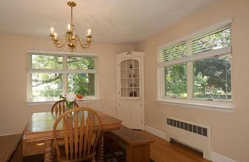 Located on corner lot in attractive treed neighborhood, this expanded 3Bed/1.5Bath brick cape offers spacious, light-filled rooms, new state-of-the-art gas fired heating system, newer architectural roof, 2 fireplaces, hardwood floors, thermal windows, expansion potential on 2nd floor and basement, 2 car garage, patio and lovely level yard.