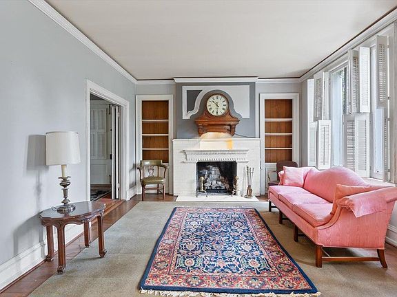 The living room has a gas fireplace flanked by built-in bookcases. Off the dining room is an enclosed porch, both rooms are considerably large in size! Upstairs the primary bedroom is great size w/ walk-in closet. 3 additional bedrooms, one is currently an office & another was the original servants quarters with a back staircase leading to the kitchen. Driveway with circle turn around, leads to the carriage house /2 car garage which has an upstairs. So much potential in this home! SOLD IN CURRENT CONDITION.