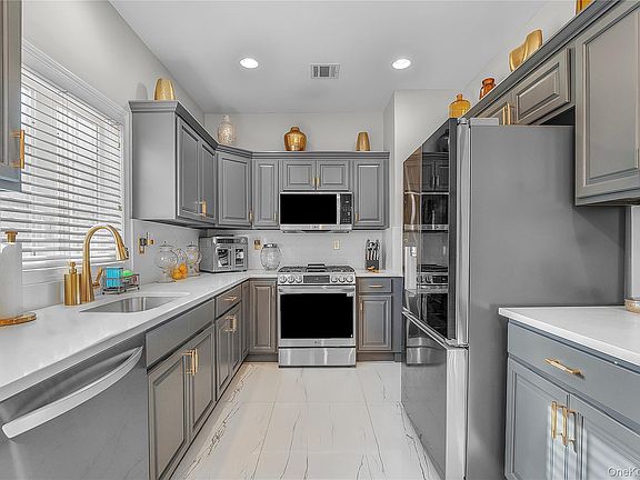 A home outfitted with all the swanky finishes from stainless steal appliances, contrast gold kitchen faucet and cabinetry handles grounded by most luxurious marble flooring.