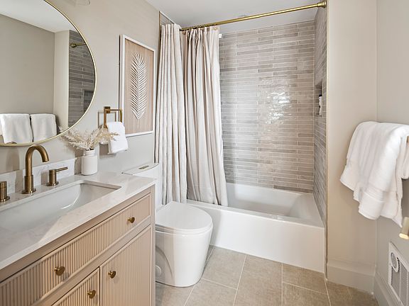 The primary bathroom is designed with relaxation and luxury in mind. Featuring sleek vertical tile, a pebble-style floor, and modern brass fixtures, this space elevates your daily routine. Enjoy a dual shower experience with both a rainfall showerhead and a handheld option, perfect for unwinding after a beach day.