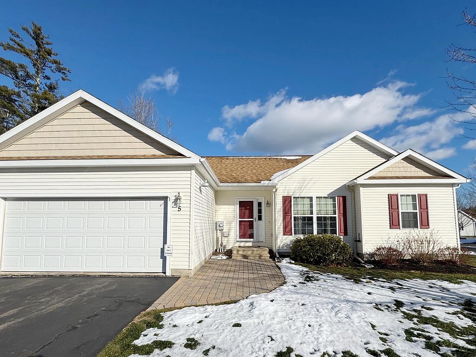 Welcome to 5 Siesta Ln, this gorgeous 2 bedroom, 2 bath Ranch Style home sits on a sizable corner lot! As you walk thru the front door, you will see a light and bright open concept home. Spacious entryway leads to the living room, kitchen with center island, stainless steel appliances, and cozy dining area. Then onto the large primary suite, and bath with walk in shower. Did I mention the stack washer /dryer closet? As we go back thru the house, there is a full bath, bedroom, the garage and the door to the basement where the major utilities are. This space is wide open for finishing or just using as storage. Paved driveway, paver walkway, lawn irrigation, and a 12x12 rear deck completes this gem. Association Fee is $300 per month and pets are welcome.