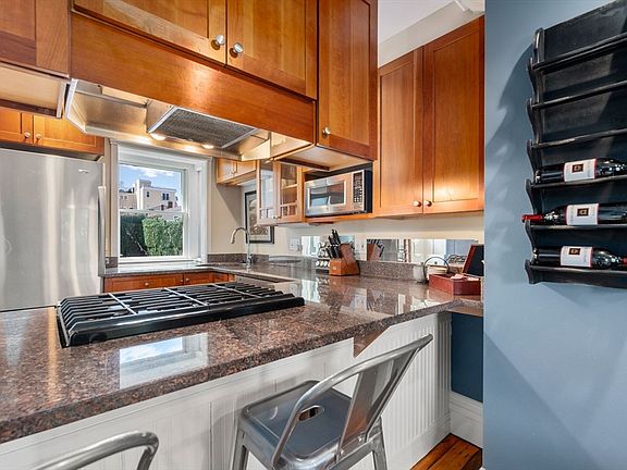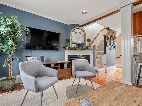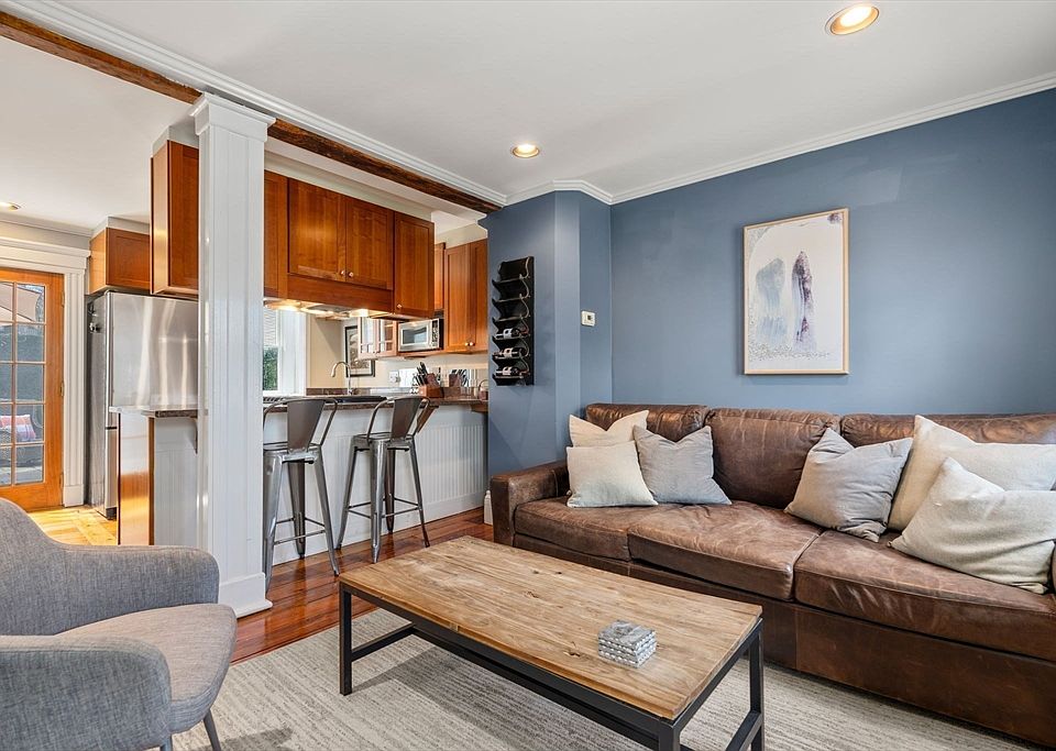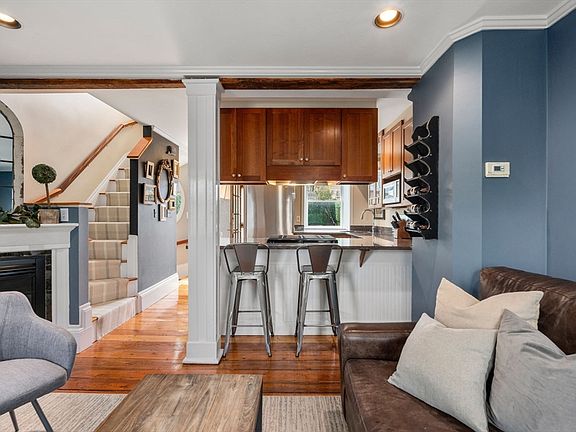 Tucked away on a quiet lane illuminated by historic gas lamps, this delightful 3-story townhouse offers 2 bedrooms, 2 full bathrooms, and timeless character throughout. Bathed in natural light, the home showcases wide-plank pine floors, custom crown molding, and a cozy gas fireplace. The open-concept chef’s kitchen features rich cherry cabinetry, stainless steel appliances, granite countertops, and a center island with seating—ideal for casual dining or entertaining. Just off the living area, enjoy a beautifully fenced private patio, perfect for outdoor dining and evenings by the fire pit. Upstairs, the spacious primary suite includes double closets, an ensuite bath, and in-unit laundry. Additional highlights include central air conditioning, generous basement storage, and a private entrance. Pet-friendly and conveniently located near public transit and parks, this inviting home blends charm, comfort, and urban convenience.