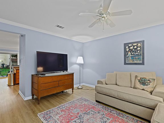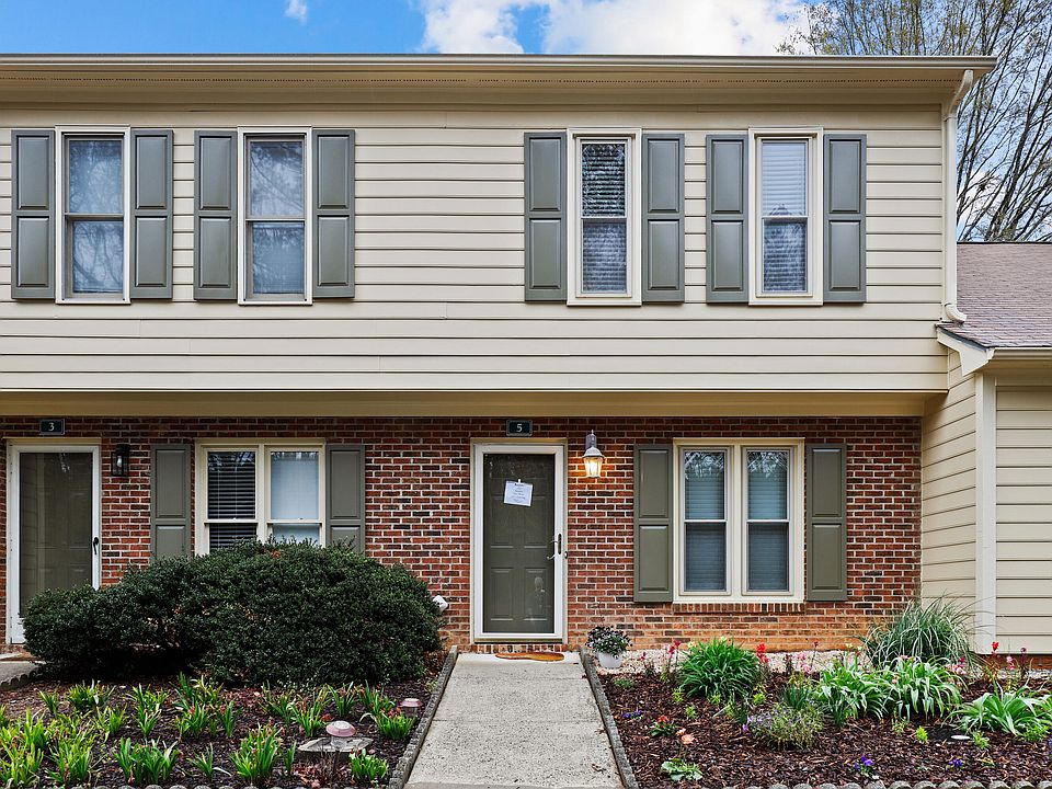 Well maintained townhome in a popular, secluded, small community. Well tended, lovely landscaping in the neighborhood. Two spacious bedrooms & two baths upstairs with a powder room downstairs. Primary BR has 2 walk-in closets. LVP downstairs, new carpet upstairs. Smooth ceilings. 4 lighted ceiling fans. Granite countertops, updated lighting in all bathrooms. Solid surface kitchen countertops. Walk-in pantry. Refrigerator has working ice maker, washer, dryer convey. Exterior storage closet off patio. Attic storage for light items. Window blinds. Crown Moulding. Professionally cleaned and move-in ready. HVAC replaced in 2022 and water heater replaced in 2016. $2K Townhome assessment already paid by seller (for new siding). Close to Duke, Downtown Durham, RTP, I-885, shopping and dining. Parking spaces are not numbered: Two directly in front of 5 SS bordering the pavement divider, otherwise park along the grass.