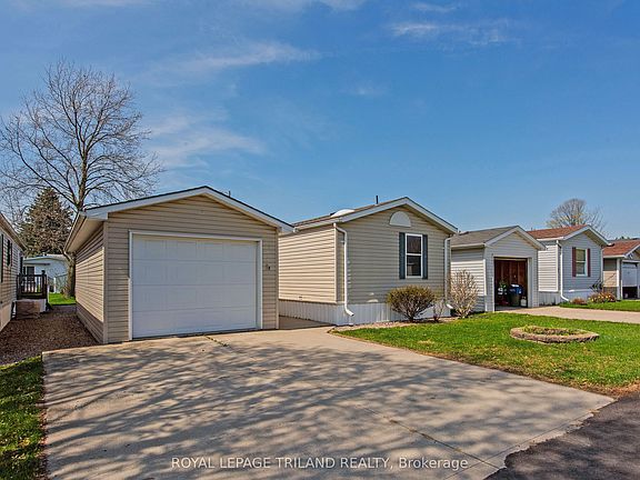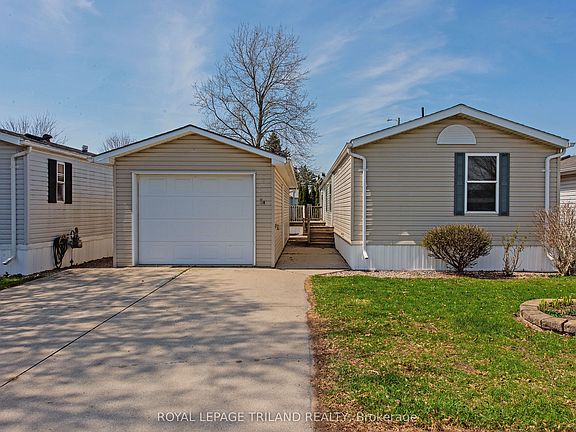 Welcome to 5A Stewart St. in Strathroy, located in the highly sought-after community of Twin Elm Estates! This charming home is nestled on a quiet street and features three bedrooms and two bathrooms, providing the perfect layout for comfortable living. The open-concept design is accentuated by high ceilings and a large kitchen, ideal for hosting family gatherings. The primary bedroom features an en-suite bathroom, convenient main floor laundry, and newer flooring throughout the main areas of the home. You'll find plenty of storage space, including a detached one-car garage with additional storage. The decent-sized deck offers a private outdoor space perfect for summer barbecues and entertaining friends and family. This home is ready for your personal touch to make it your own. Enjoy low-maintenance living in this wonderful community, an excellent choice for those looking to downsize, embrace a simpler lifestyle, and be part of a thriving small community. Don't miss the opportunity to call this bright, inviting home yours! Land Lease Fee: 800.00, Land Taxes per month (estimate): 36.55, Structure Taxes per month (Estimate):44.31, Garbage Collection per month : 11.59 Total Monthy: 892.45