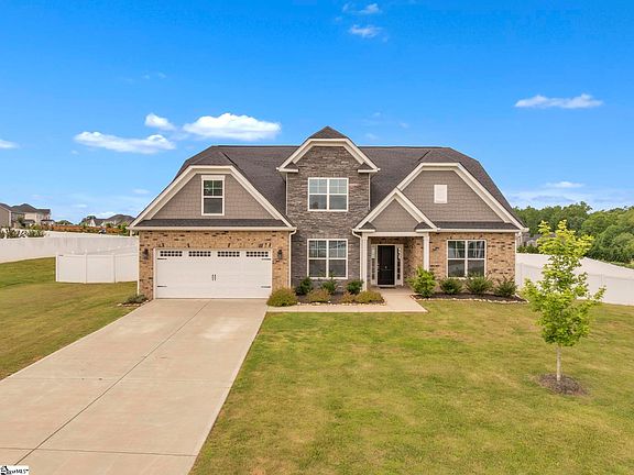 Welcome home to this thoughtfully designed five-bedroom, three-bath home built in 2022, nestled on a spacious fenced-in lot in the highly sought-after Five Forks area. With a bright and open floor plan, this home offers both comfort and functionality, featuring modern touches throughout. Step inside and you'll find a 12-foot coffered ceiling in the living room, complete with a cozy gas fireplace and floor-to-ceiling built-in bookshelves with cabinets perfect for storage. The living room flows seamlessly into the gourmet kitchen, where a large island, gas stovetop with vented hood, double oven, convection microwave, and butlers pantry (with wet bar area) make entertaining a breeze. Add in a breakfast nook and a flex dining room or sunroom, and you've got options for every occasion. The spacious primary bedroom is located on the main floor and features a large walk-in closet and a luxurious en-suite bathroom with double sinks and a huge walk-in shower. Two additional bedrooms and another full bath round out the downstairs, making it perfect for guests or everyday living. Upstairs, you'll find a roomy loft area ideal for a media room, playroom, or home gym plus two more bedrooms and full bathroom. The large backyard is fully fenced with crisp white vinyl fencing-great for privacy. You'll also enjoy proximity to amenities like the MESA Soccer Complex and all the shopping/restaurants that Five Forks has, making daily errands or weekend fun just minutes away.