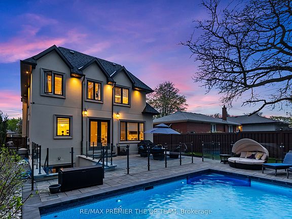 Discover refined luxury in this stunning custom-built home in Etobicoke's sought-after West Deane neighbourhood. Featuring elegant limestone accents and impeccable craftsmanship throughout, this residence offers 10' ceilings on the main level, 9' ceilings on both the second floor and finished basement, and soaring 11' coffered ceilings in key areas. Enjoy rich hardwood floors, custom drapery, and a sun-filled skylight over the staircase. The chef-inspired kitchen boasts quartz countertops, premium appliances, and is perfect for both everyday living and entertaining. The primary suite features heated floors for year-round comfort, while the walk-out basement adds functional living space for relaxation or gatherings around the In-ground saltwater pool. Smart upgrades include recessed ceiling speakers with a 5-zone amplifier on the main level, as well as integrated speakers in the primary suite and basement. The home also offers a 2-car garage with EV charging, and a gas BBQ hookup for outdoor enjoyment. Ideally located close to top-rated schools, parks, trails, golf courses, major highways, and shopping. This home blends luxury, comfort, and convenience in the heart of Etobicoke.