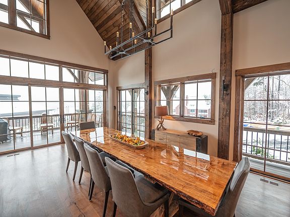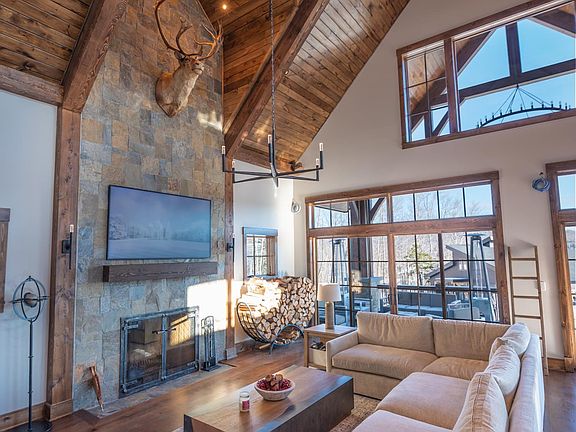 Trailside luxury that stands in a class of it's own. This stunning new construction sits immediately trailside at Mount Snow and overlooking the valley with stunning sunrise mountain views. Ski to and from your rear mudroom door and never worry about shuttles or parking again. The architect designed home was built sparing no expense. As you walk into the main entry, you are greeted by a 3 story spiral log staircase with natural stone facade. This is truly breathtaking. Wander from here into the expansive great room with triple height natural wood ceilings, a glass wall out to the views and covered entertaining porch, chefs kitchen with stainless appliances, custom cabinets, granite counters, and majestic island, as well as wet bar. Down the hall you can find a walk in pantry, half bath with natural stone basin sink, first floor guest suite, spacious ski trail mudroom with brick floors, and oversized two car garage. Upstairs are three more full suites including a primary with spa like bath, hidden walk in closet, play loft in another, and vaulted ceilings in all three. The lower level features a family room, fireplace, game area, bunk room suite, second wet bar, large owner closet, and lower patio with hot tub. There is whole home automated lighting, radiant heat, a/c, hvac, and more. A prime location at the top of the Seasons community affords you access to recently renovated amenities including indoor and outdoor pools, full gym, basketball court, game room, and more.