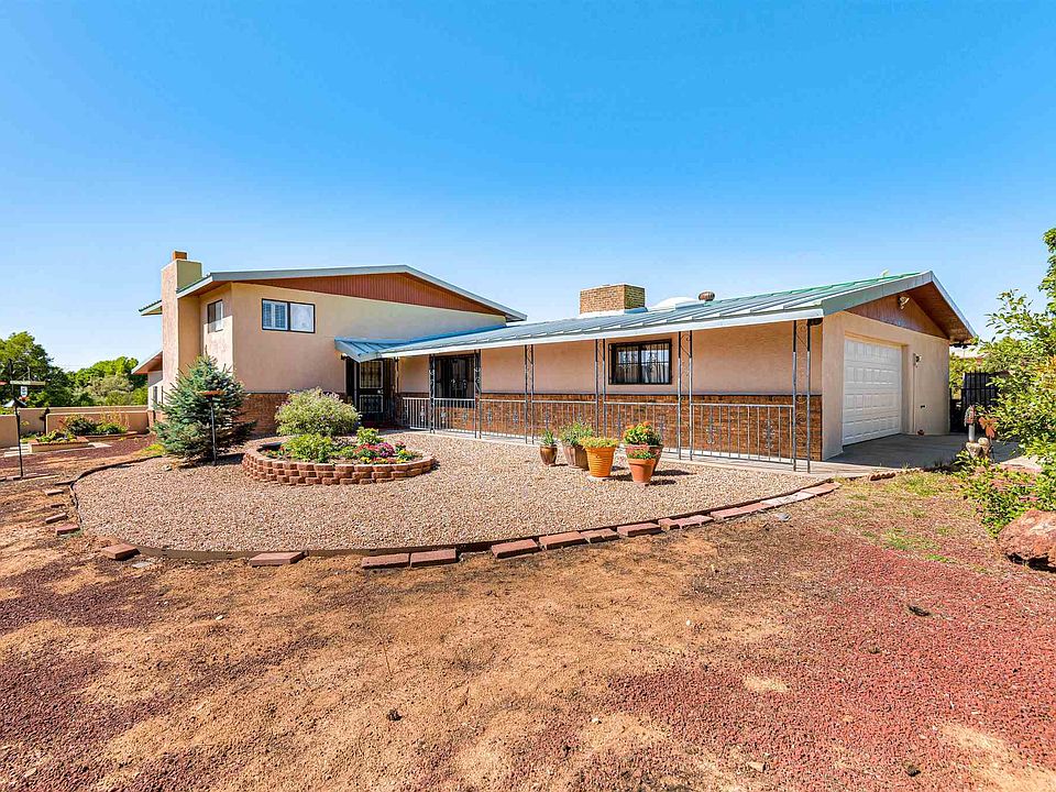 Nicely remodeled 4 bedroom 3 bath Northern New Mexico style home with indoor pool, office space, multiple living areas, and a detached 775 sq ft professional artists studio on 1.08 acres in La Cienega. Surrounded by a wall and fence for privacy, this home has hardwood floors, Sangre de Cristo views and plenty of space to expand. The spacious living room has a whitewashed brick fireplace with insert, and ample wall space for displaying art. The roomy kitchen has been updated with stainless steel appliances, corian countertops, rich wood cabinetry and has a small bay window above the sink. And tile backsplash and floors complete the look. Just off the kitchen is an eating area that flows into the living room allowing for ease of entertaining. On an upper level, the master bedroom has its own fireplace with seating area, an ensuite bathroom with vanity and a step in shower. The other bedrooms located on the main level are nicely separated from the master offering privacy for your guests. On a lower level, the office opens to the indoor heated pool with French doors that open to an enclosed garden area with a peach tree, rose bushes and a patio. The separate artist's studio has electric heat, portable A/C, vaulted ceiling, French doors and ample room to create. Roof on studio was recently replaced. Located just minutes from Santa Fe, this home is on a private well, has an attached 2 car garage and space for RV parking. No HOA.