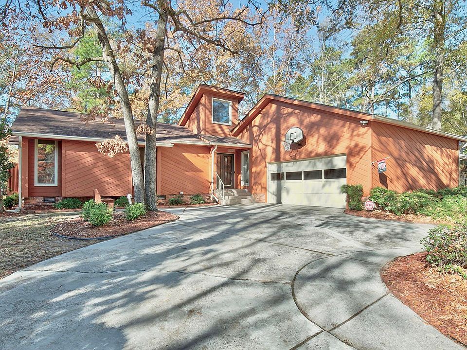 Welcome to 5 Tawny Branch Court, a meticulously maintained single-level contemporary home nestled into a quiet cul-de-sac in the Harbison community. This 3 bedroom, 2 bath home showcases a beautifully landscaped yard enhanced by a circular driveway, brick edged garden beds, and a welcoming front entry with custom ceramic tiled steps leading to the stunning double wooden doors. The grand living room features soaring vaulted ceilings, exposed beams, a striking brick fireplace encased by custom wood panels, and upgraded automatic blinds that allow effortless light control and privacy at the touch of a button. Large new windows in the living room and dining room fill the home with natural light. The kitchen blends functionality with custom wood cabinetry, upgraded convention microwave, and nostalgic charm with the vintage breakfast nook creating a welcoming hub for daily living. The primary suite offers a unique multi level layout featuring a relaxing sitting area with natural light pouring in through the sliding glass doors with built in, dust free blinds that lead to a private balcony. The list continues with double closets, built in storage, and a primary bathroom boasting an updated spa-like walk in shower with a glass enclosure and built in bench for added comfort and convenience. Relax year round in the private hot tub on the spacious screened porch or unwind on the back deck overlooking the soothing brick lined waterfall feature. This backyard creates an ideal retreat for both entertaining and quiet evenings at home. Sitting on almost half an acre, the property includes a generous 2-car garage with a built in workbench and storage, plus a large site-built workshop with electricity and plumbed for water. Located minutes from Harbison’s walking trails, shopping, dining, and I-26, this home delivers space, convenience, and charm in one of Columbia’s most desirable areas. Disclaimer: CMLS has not reviewed and, therefore, does not endorse vendors who may appear in listings.