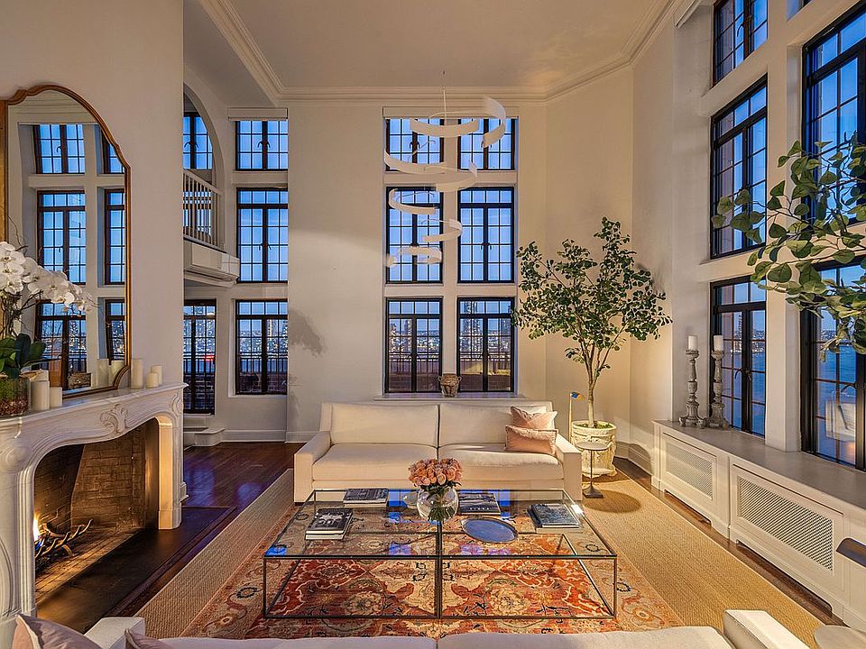 A one-of-a-kind penthouse where architectural drama meets timeless sophistication. Soaring 18-foot ceilings and triple-height casement windows frame sweeping East River and skyline vistas, offering a cinematic backdrop of New York's ever-changing light.