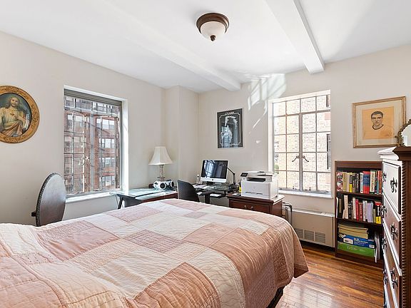 Sun-filled and pin-drop quiet corner-end unit 1 Bedroom | 1 Bathroom with pre-war charm, high-beamed ceilings, molding, built-in cabinets, marble window sills, and original floors is a rare find. The kitchen area has black granite countertops, stainless steel appliances, a dishwasher, a micro-convection oven, custom maple cabinets, and a Miele cooktop. The bedroom has two exposures and can easily accommodate a queen-sized bed, a dresser, night table, and desk. The windowed bathroom is fully tiled. There are three large closets, including a walk-in closet in the bedroom. Electric is included in the maintenance. Please note, scaffolding has been removed.