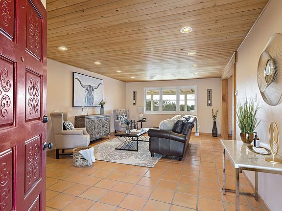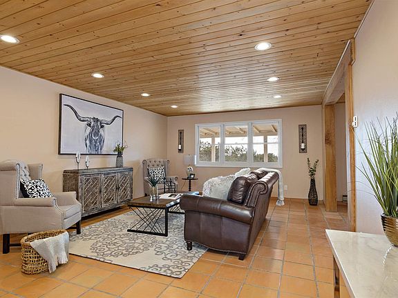 Northern New Mexico pitched roof home on the coveted Verano Loop, in Eldorado. The spacious covered front patio welcomes you to this traditional style home, with Saltillo tile floors and tongue & groove ceilings in the living/dining/family rooms. This large home has multiple flex spaces, including a roomy southwest facing sunroom with wood stove - an ideal studio. The views of the Sandia and Jemez mountains, and New Mexico sunsets are breathtaking from this property. The upgraded galley kitchen has solid surface countertops, stone backsplash, undermount lighting, double ovens & custom pantry cabinetry. Adjacent to the kitchen is an office space with built-in desks & shelving, a perfect area for all ages to accomplish their tasks. Master suite has two walk-in closets, plus the master bath has been nicely updated with a custom tile shower and vanity with dual stone sinks. Access to the expansive back covered patio is from either the master or sunroom. All 3 bedrooms are oversized. The comfortable family room has a stone wall, built-in shelving, and a cozy wood burning fireplace. There is a fenced area for your pets, several garden beds, water catchment tank and a spot off the back patio pre-wired for a future hot tub. Attached to the 2 car garage is a storage/workshop, with plenty of storage. New water heater, septic tank and leach field. Prime location, just a few blocks from the community center, dog park, tennis courts, & pool. Make sure & check out the 3D Tour link!