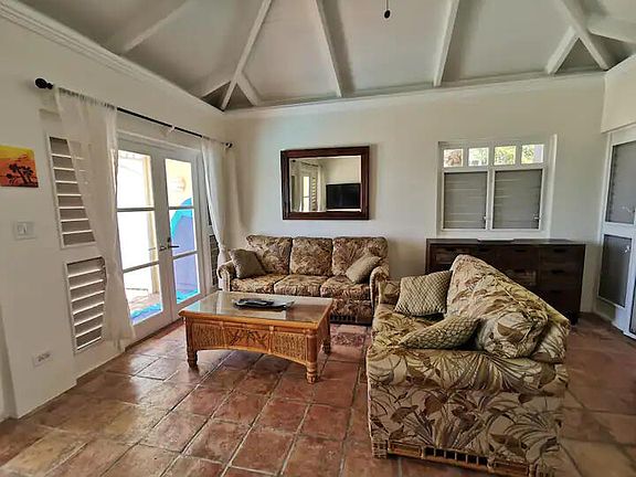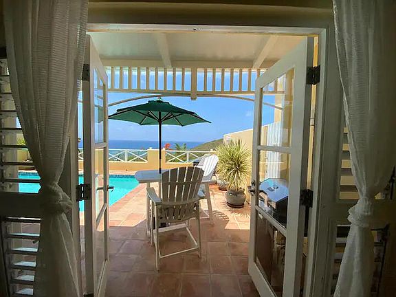 This top-tiered, one-bedroom condo at Villa Madeleine has amazing south shore Caribbean sea views! Because it's high on the hill, this unit gets cool easterly breezes from the north-east and gorgeous views towards the south. The private pool and patio just off of the living room bedroom suite create a perfect tropical living space. The kitchen and bathroom have been updated with new cabinets and beautiful granite counter-tops. Parking is just a short walk (with no stairs) to your front door!