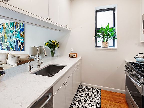 The windowed chef’s kitchen features stainless appliances, marble backsplash, abundant storage, and generous counter space for food prep. Both full bathrooms have been fully renovated, showcasing high-end fixtures, designer marble tile work, and lovely finishes.