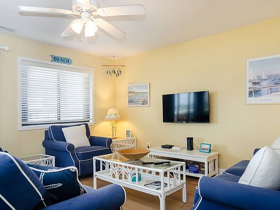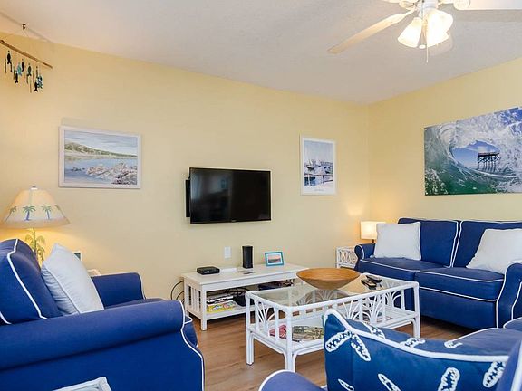 Enjoy the "Bayview" and watching the sailboats pass by at this conveniently located 3-bedroom, 2-bathroom lower floor condo. Just a short walk to the beach, coffee shops, restaurants, surf shops, and a small family-owned grocery store. The covered deck provides a great outdoor dining space with partial views of the Intracoastal waterway. An open concept floor plan with hardwood floors welcomes you into this lovely property. The living room has sliding glass doors that connect to the deck outside and has ample seating. Down the hall you have a full bathroom with a combination shower tub that services the guest bedrooms and any visitors. There is a twin bedroom that has two free standing twin beds. A second guest bedroom features a comfortable queen-sized bed. The master is at the end of the hall with a cozy queen-sized bed, flat screen TV, and a private ensuite bathroom.