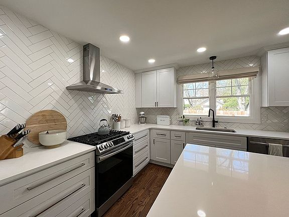 As you enter the home, you will be greeted by an inviting foyer that leads to a spacious living room with a fireplace. The main level also features a dining room and an open, modern kitchen complete with an oversized center island, sleek quartz countertops, herringbone tile backsplash and updated appliances. The hardwood floors that run throughout the main and upper level have been refinished in a beautiful dark walnut stain. This is an inviting space for all your entertaining needs.