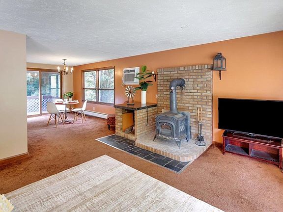 Welcome to this expansive 3-bedroom, 2.5-bathroom mid-century modern raised ranch on a quiet dead-end street in the desired hill neighborhoods of Barre Town. As you enter from the bright foyer, you'll be greeted by a large living space featuring a wall of windows that flood the room with natural light. A cozy wood stove with a brick hearth adds warmth and charm. The living area flows into a corner dining space, surrounded by windows offering views of the side yard and access to the back deck. The charming vintage kitchen provides plenty of space for cooking and entertaining and pantry storage. The main level boasts three generous sized bedrooms, including a primary suite with its own bathroom. Downstairs, a large family room with exposed beams and a second wood stove is perfect for relaxing or hosting gatherings at the bar set up tucked in the back. The lower level also includes a convenient laundry room and a half bath. The lovely yard is adorned with mature trees and features a patio with seating and a firepit, offering a tranquil setting for outdoor enjoyment. Conveniently located close to town amenities and just minutes from Montpelier, this home combines peaceful living with easy access to everything you need.