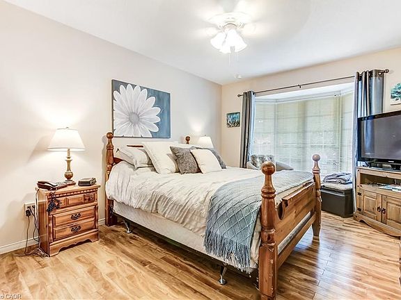 This popular "cottonwood" model has lots to offer for retirement living in the "Villages of Long Point Bay". Spacious entry way with front primary bedroom with 3 piece en suite along with a walk-in closet. Main floor Laundry room. The 4 piece bathroom has a skylight to give this room natural light, with the linen closet just in the hall bedside this bathroom. The second bedroom makes a great second bedroom or a computer room. The open concept dining living room and eat-in kitchen give these rooms a nice open feeling, with hardwood flooring in the dining and living rooms. Lots of cabinets and counter space in the kitchen help to get your cooking and cleaning done a whole lot easier. 3 year old furnace and central air, Step out to your large patio deck from your eat-in kitchen area. This home is just a short walk to the villages clubhouse complete with indoor heated pool, exercise area, billiards, banquet hall, library and so much more. With local pharmacy, grocery store, and restaurants, this area has everything you want all in one lakeside community.